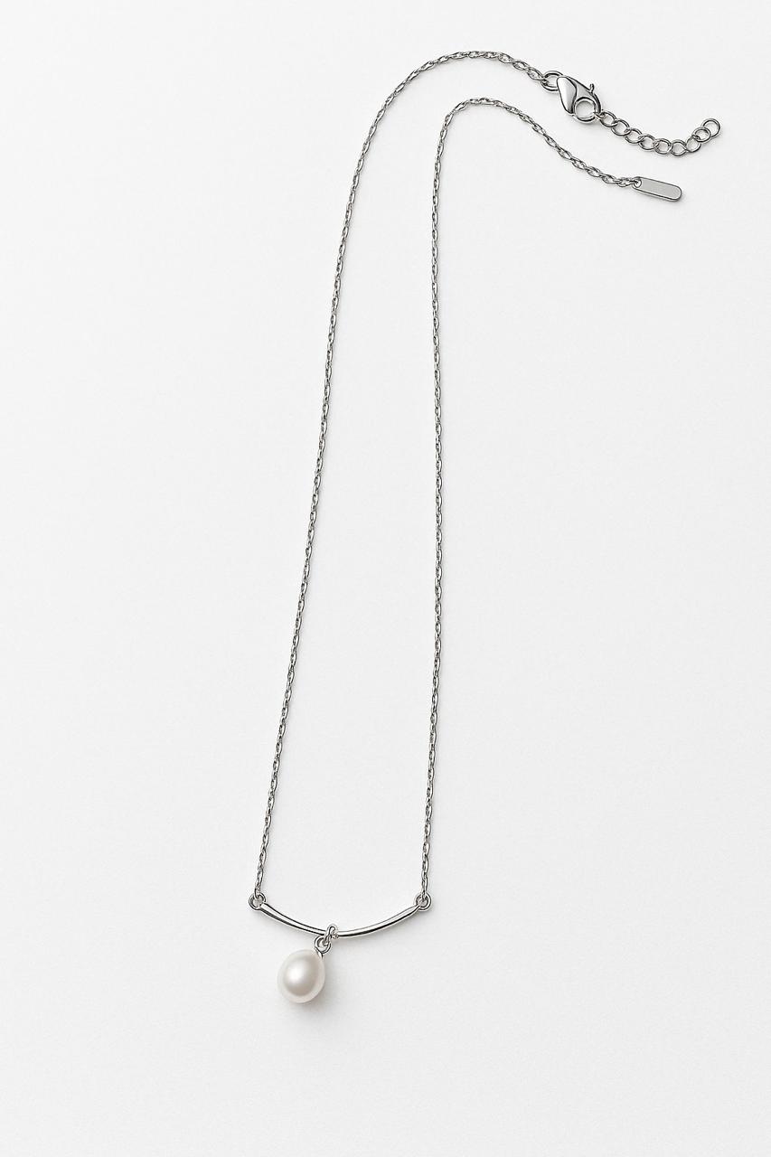 Embrace understated elegance with this minimalist silver necklace, featuring a graceful curved bar and a single luminous pearl drop.
